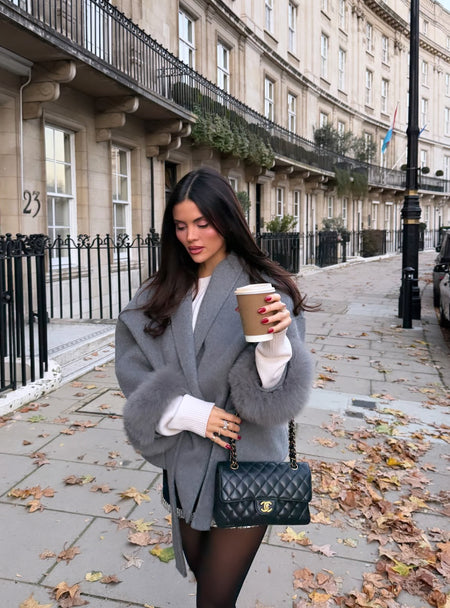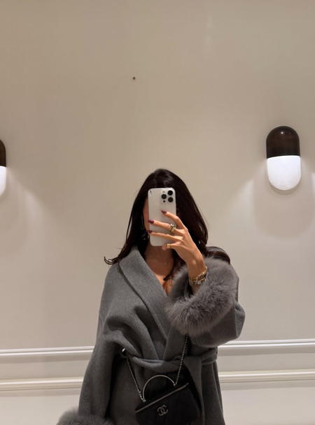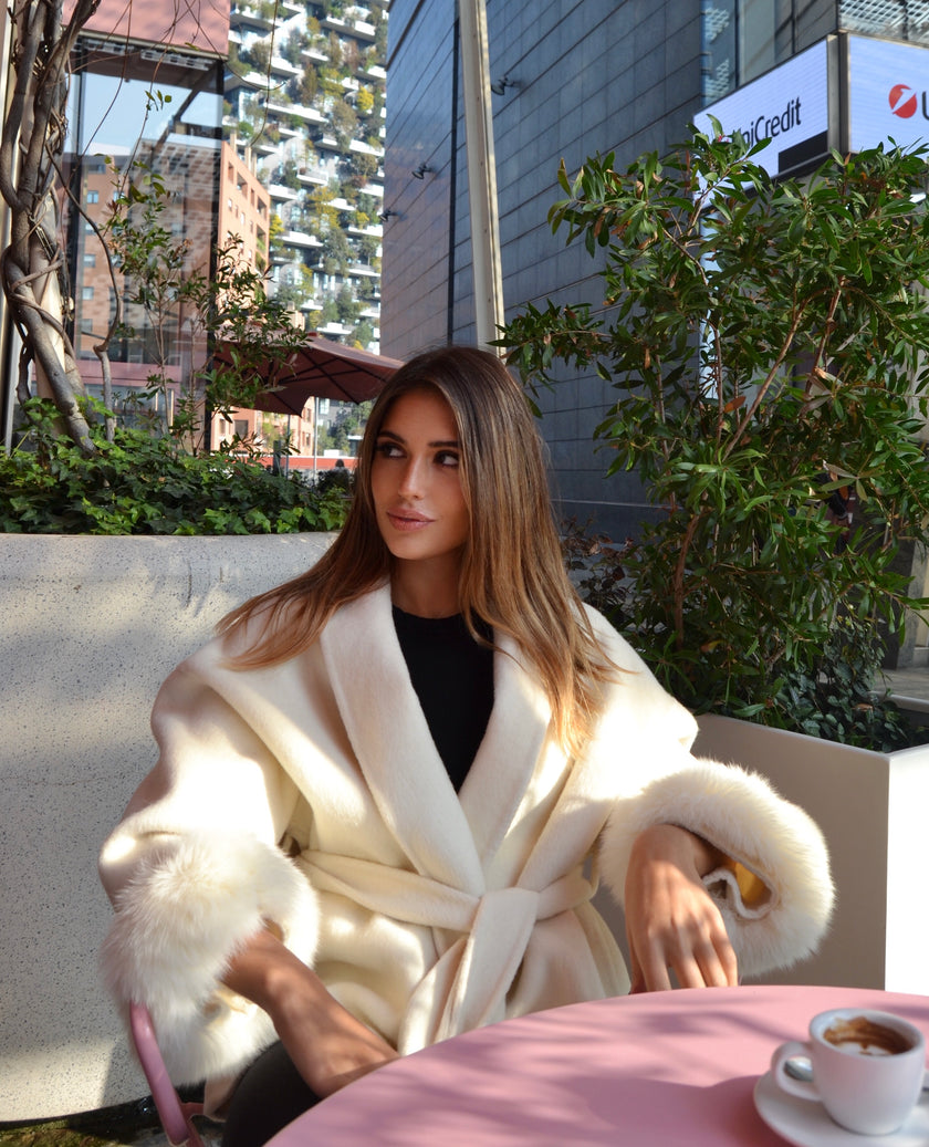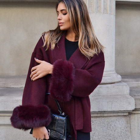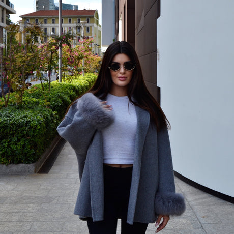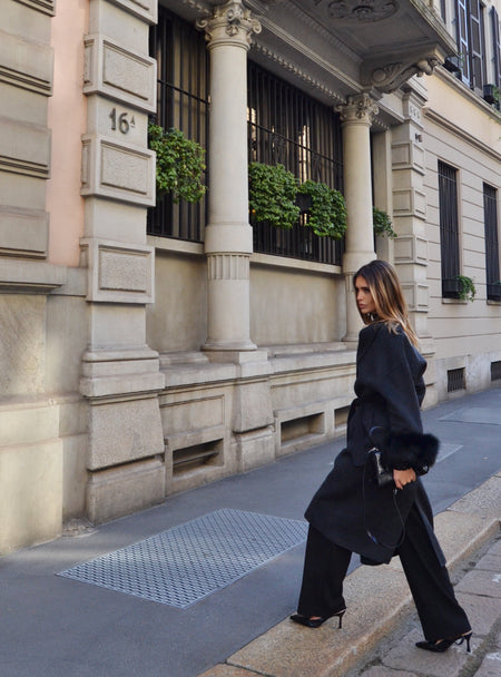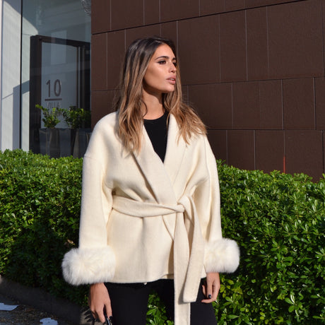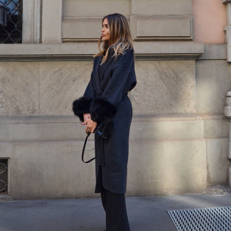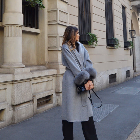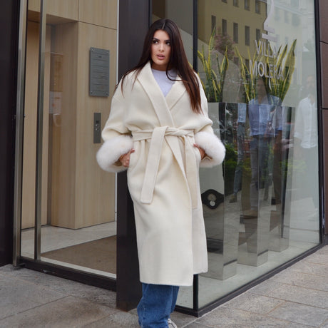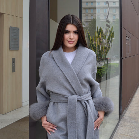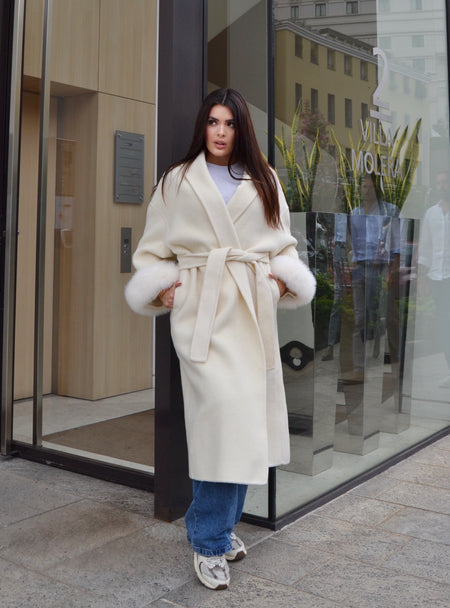 Our Blair long coat, crafted in double wool with a waist belt and fox fur cuffs, combines warmth, structure, and elegance for a flattering silhouette. Luxurious fox fur cuffs for a refined touch.