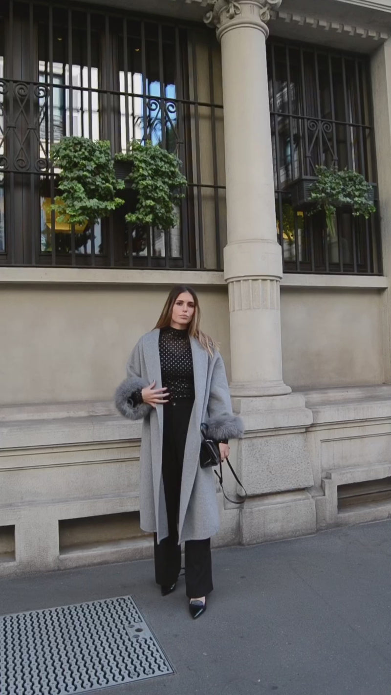 Blair — Long coat in double merino wool with removable fox fur cuffs
